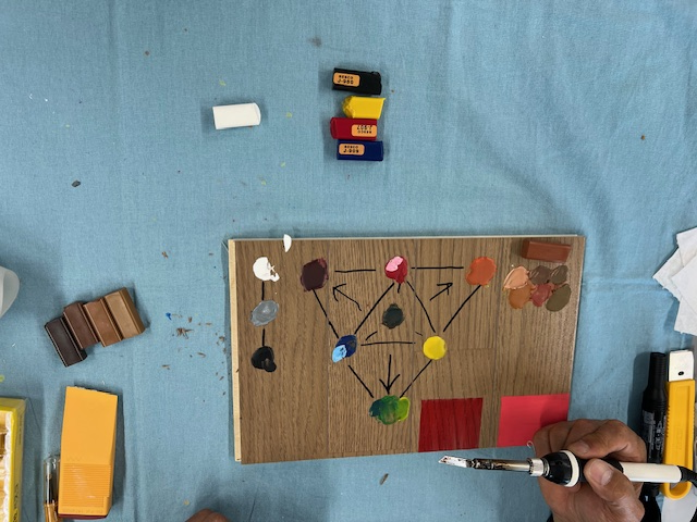 写真なので分かりづらいですが、真ん中の赤、青、黄を中心として、赤と青を混ぜれば紫に、赤と黄を混ぜればオレンジに、青と黄を混ぜれば緑にを調色の基本とし、どの色が強いかを意識し、写真の図の対極にある色を足していけば、求めている色に合わせることが出来る! との内容です。